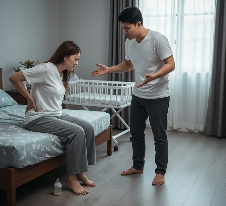 “Cô lại giả vờ đau à? Phụ nữ sinh xong ai chẳng mệt. Đừng than vãn nữa, làm như mình phải chăm mẹ vậy,” anh lạnh lùng nói.